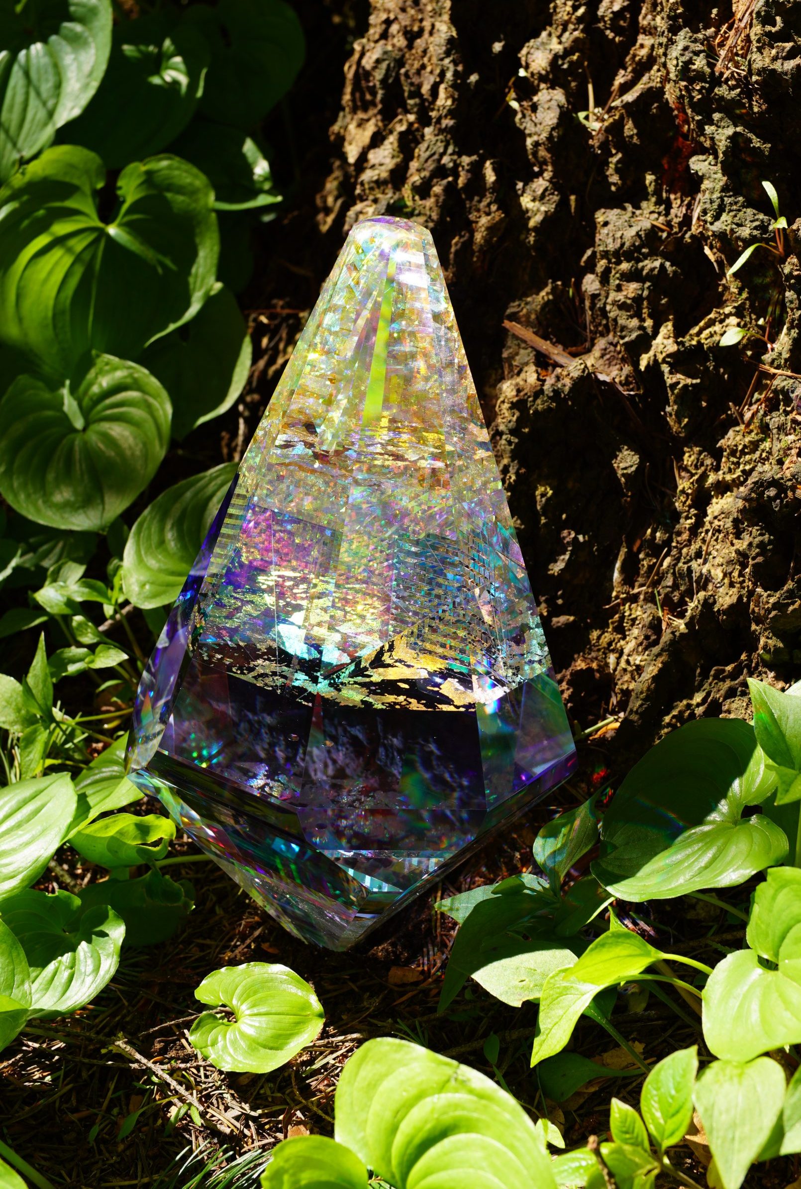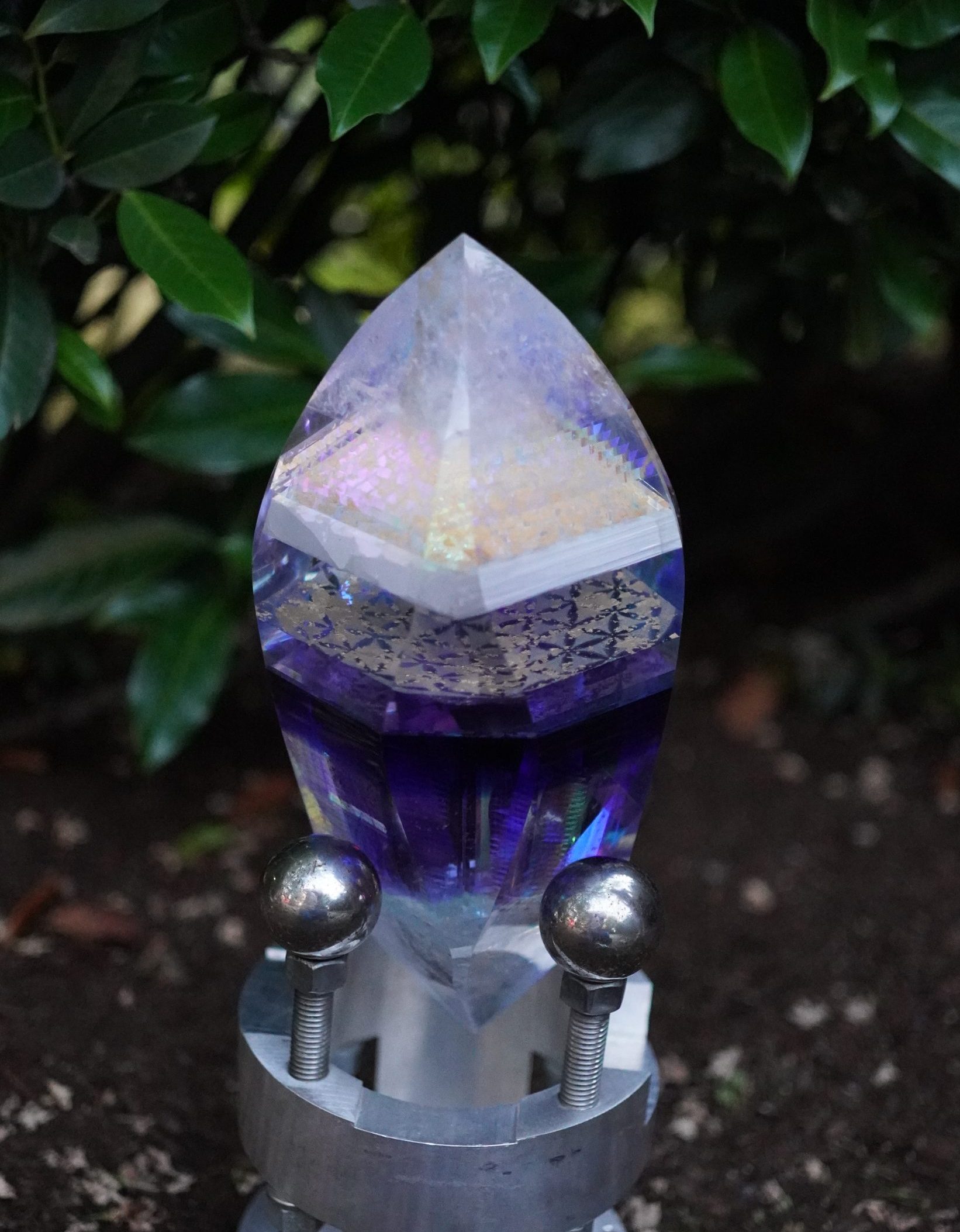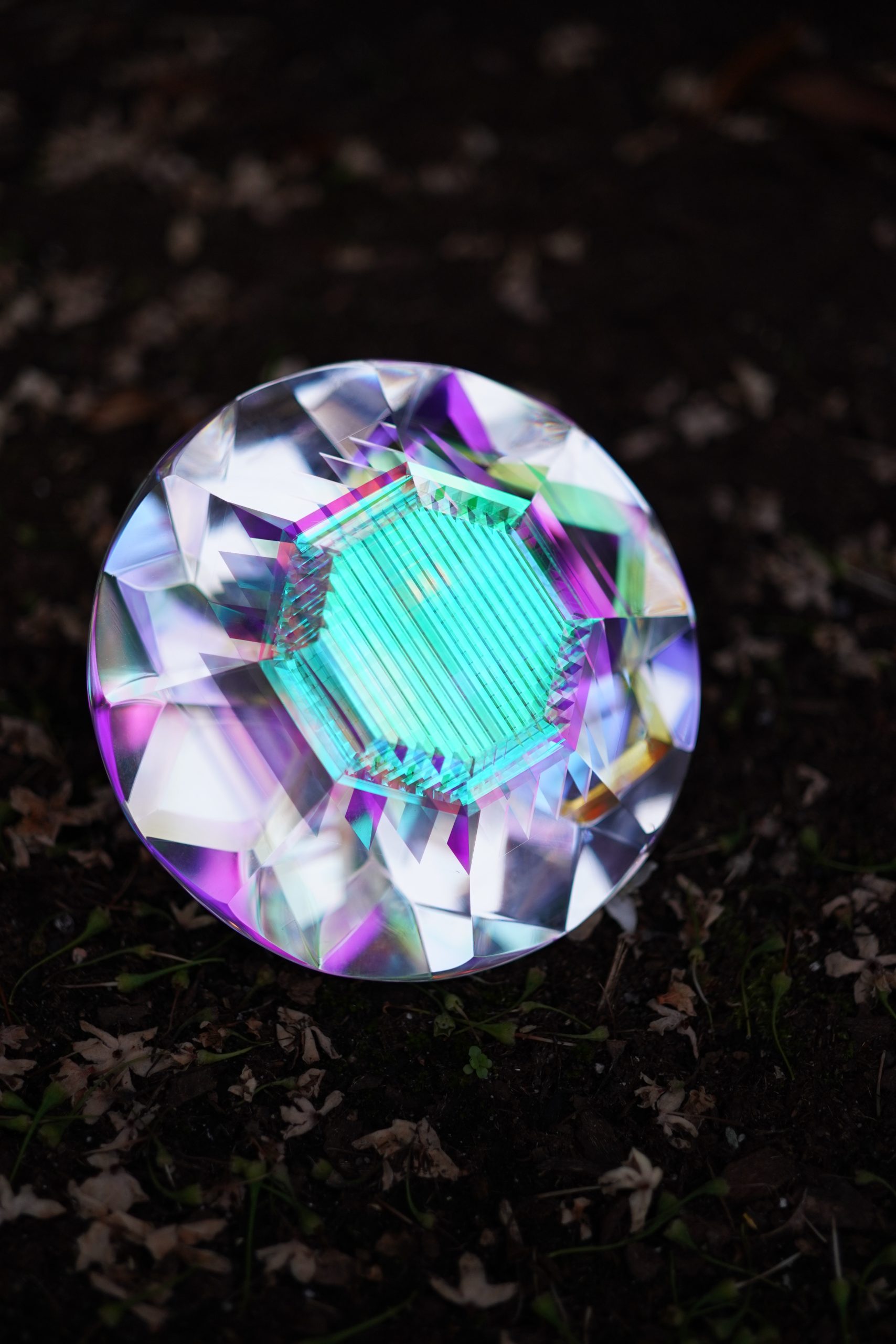 ExploreAlüf intentionally designs sacred geometrical artwork and focuses on maximizing beauty & elegance in white light, while also imbuing magical qualities only revealed in the dark with laser light. His “paints” consist of natural crystals, precious/semi precious stones as well as optical crystal & dichroic glass while his hands and grinding machines are his “paintbrushes”