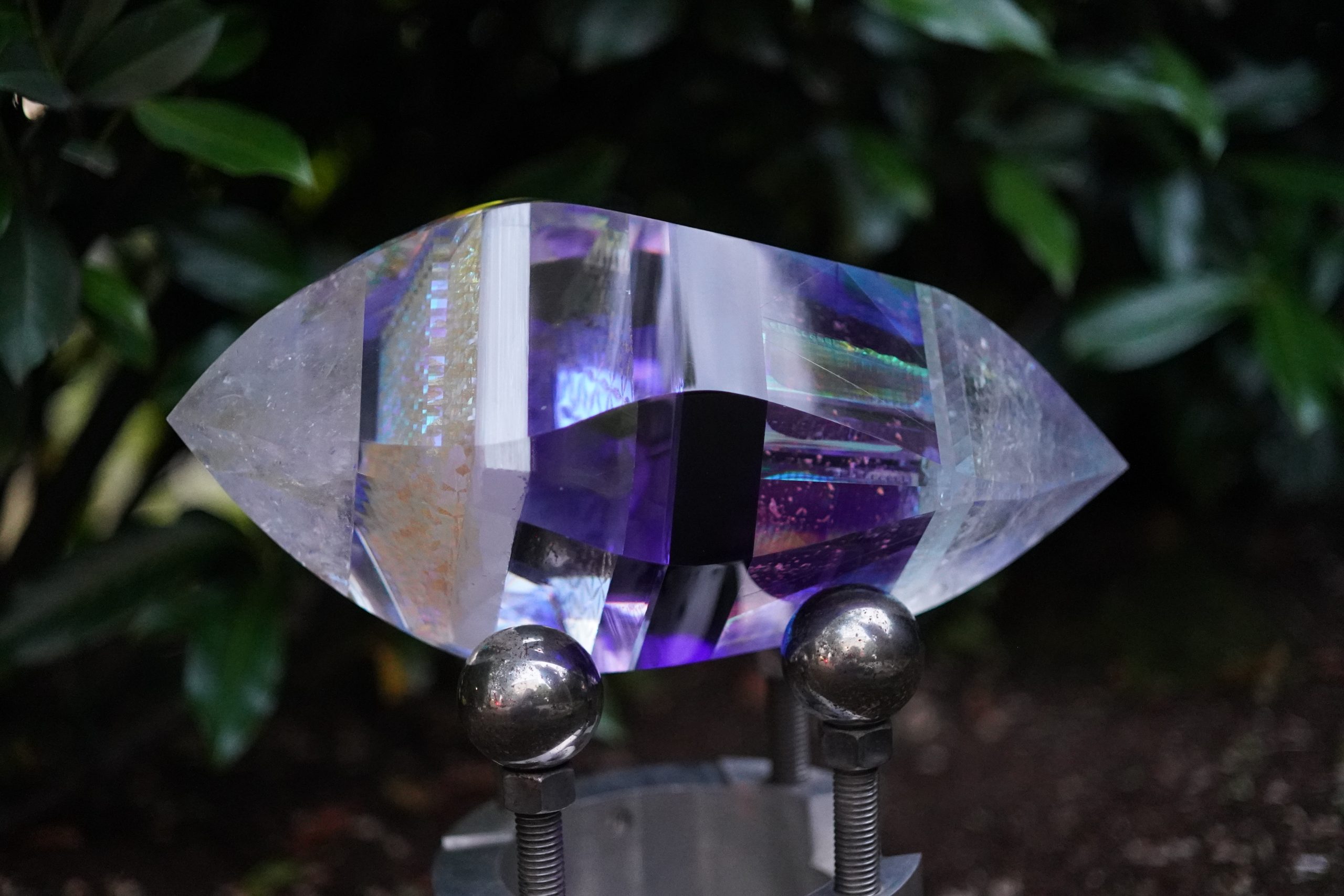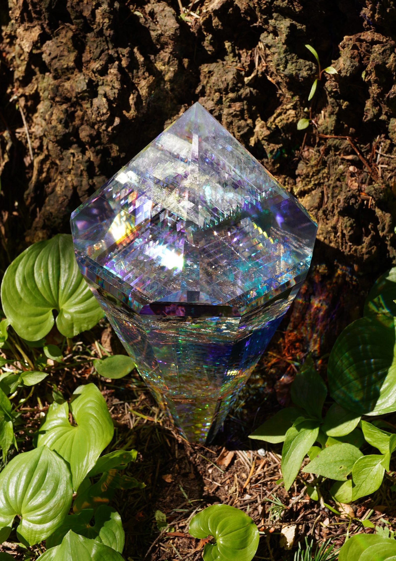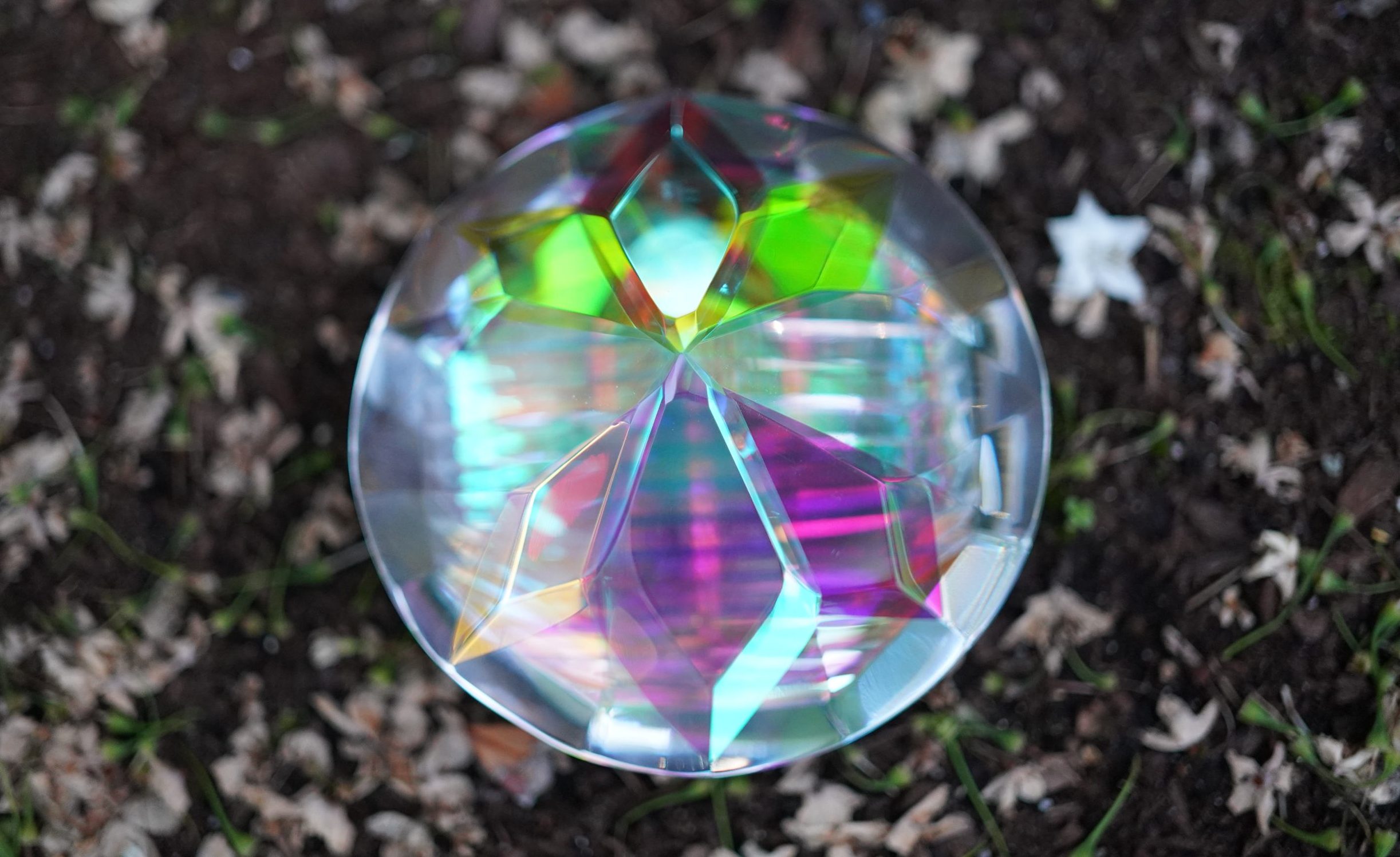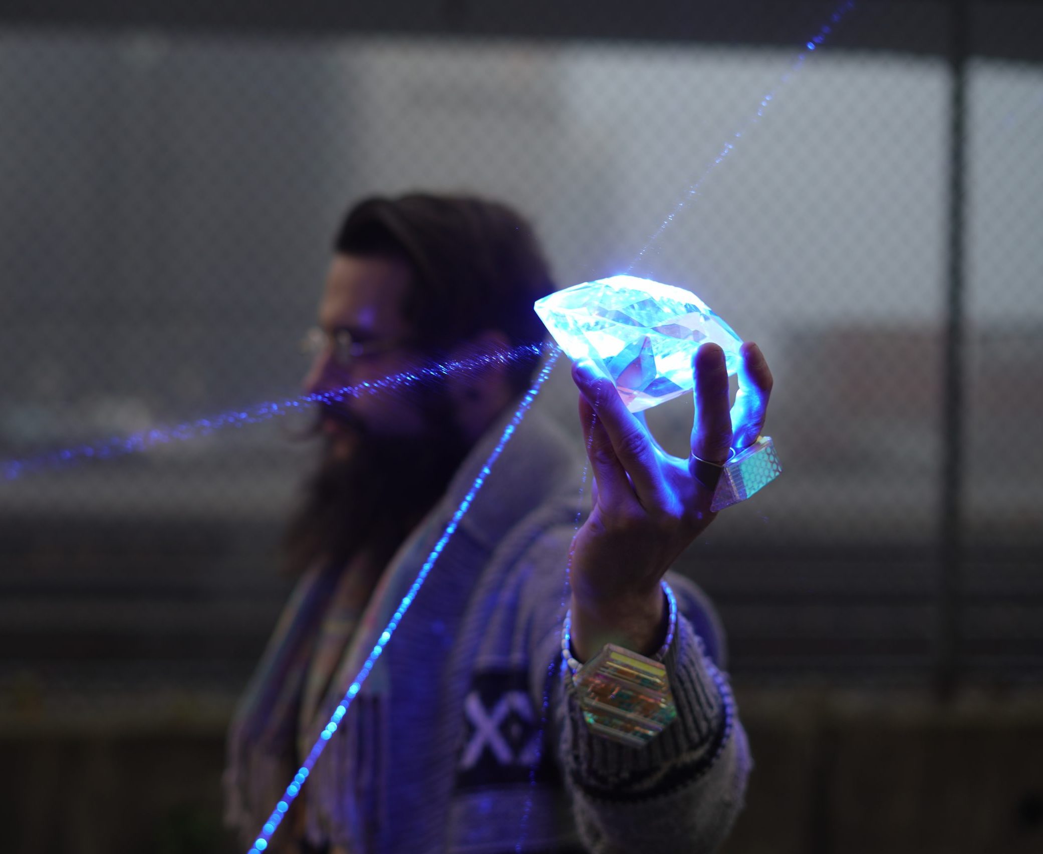 ExploreAlüf intentionally designs sacred geometrical artwork and focuses on maximizing beauty & elegance in white light, while also imbuing magical qualities only revealed in the dark with laser light. His “paints” consist of natural crystals, precious/semi precious stones as well as optical crystal & dichroic glass while his hands and grinding machines are his “paintbrushes”