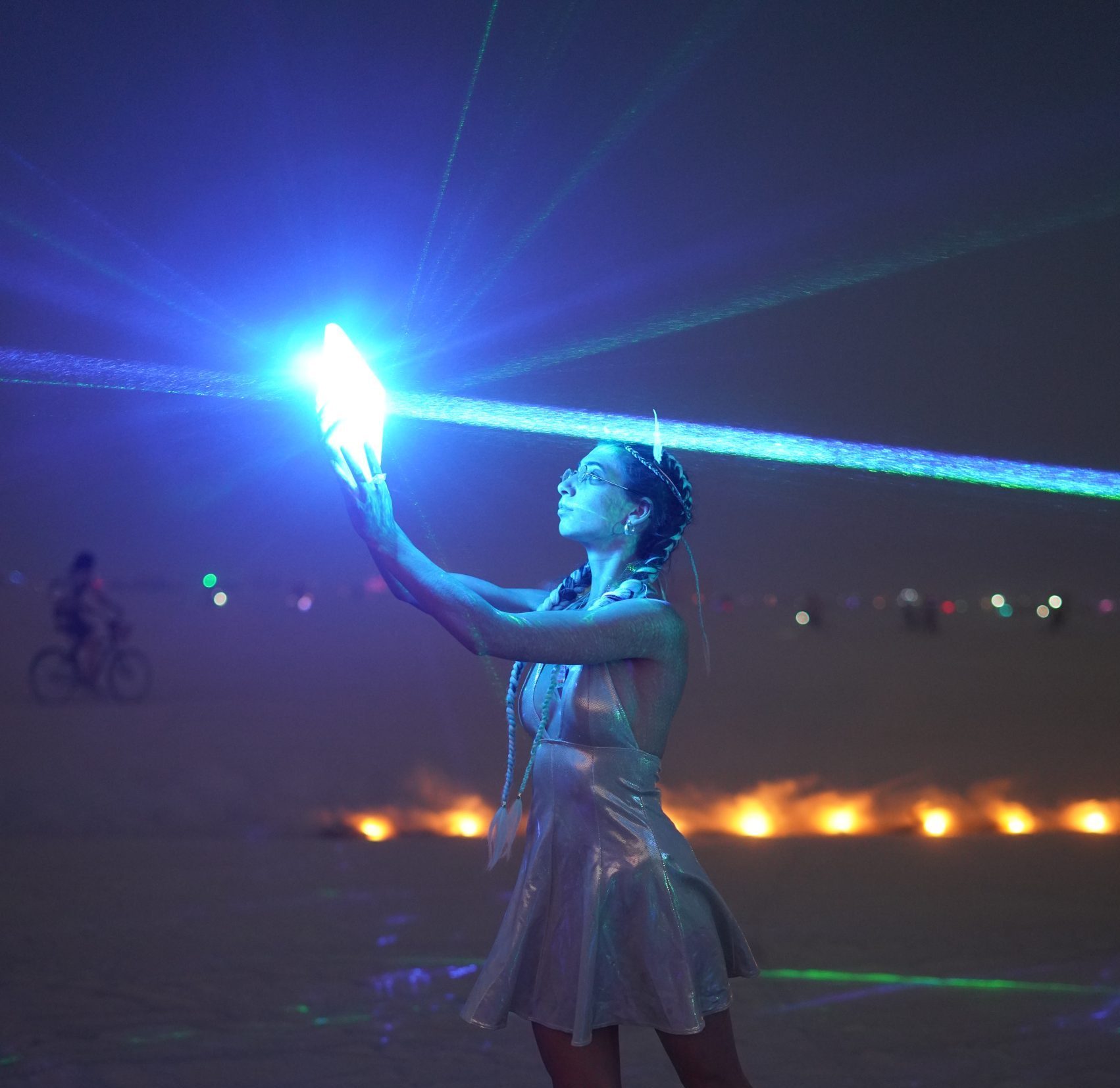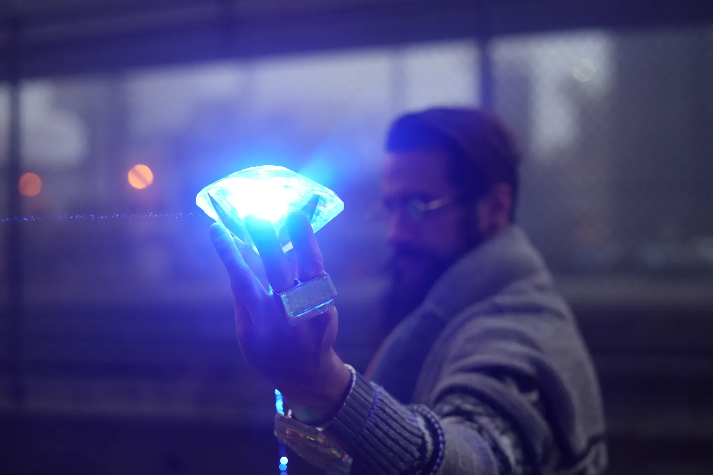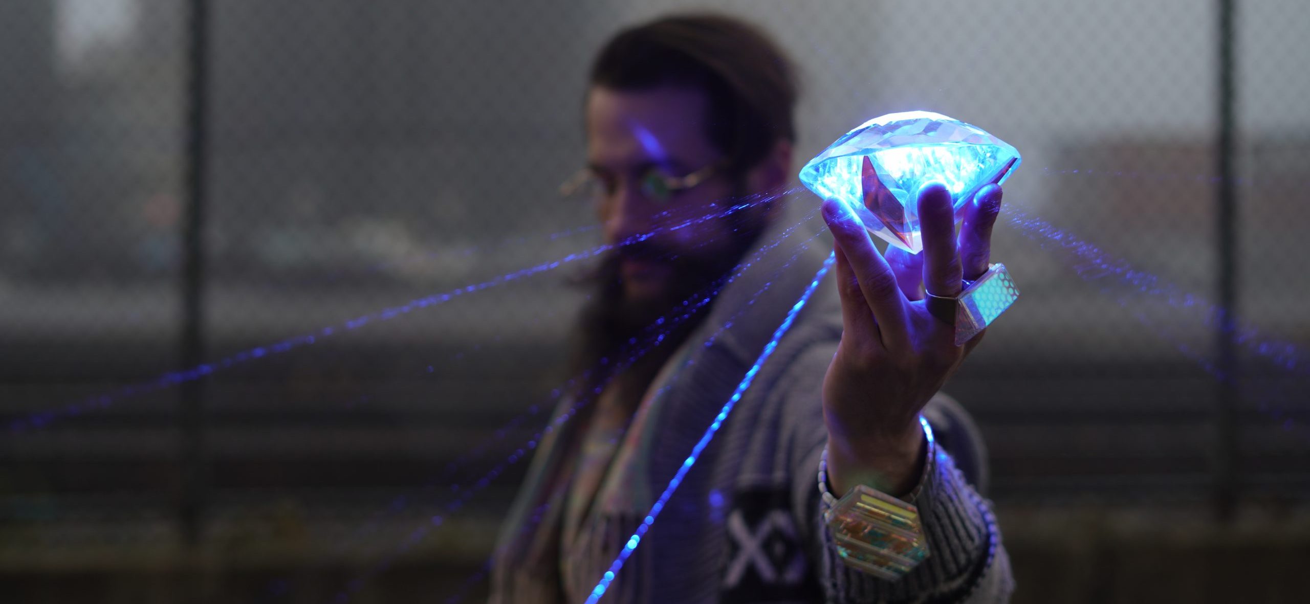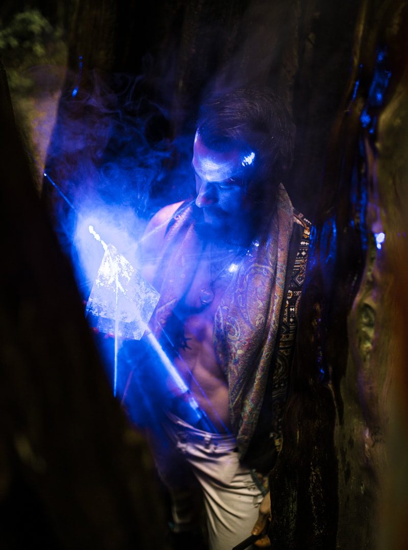 Along his artistic discovery journey, Eric quickly realized the potential his artwork could have in the dark with laser light. Each additional outside facet and inside layer of certain elements creates a unique reflection/refraction/splitting nexus point for the laser, exponentially adding to the effect. Once you surpass a certain threshold of these nexus points, the result is absolutely breathtaking.