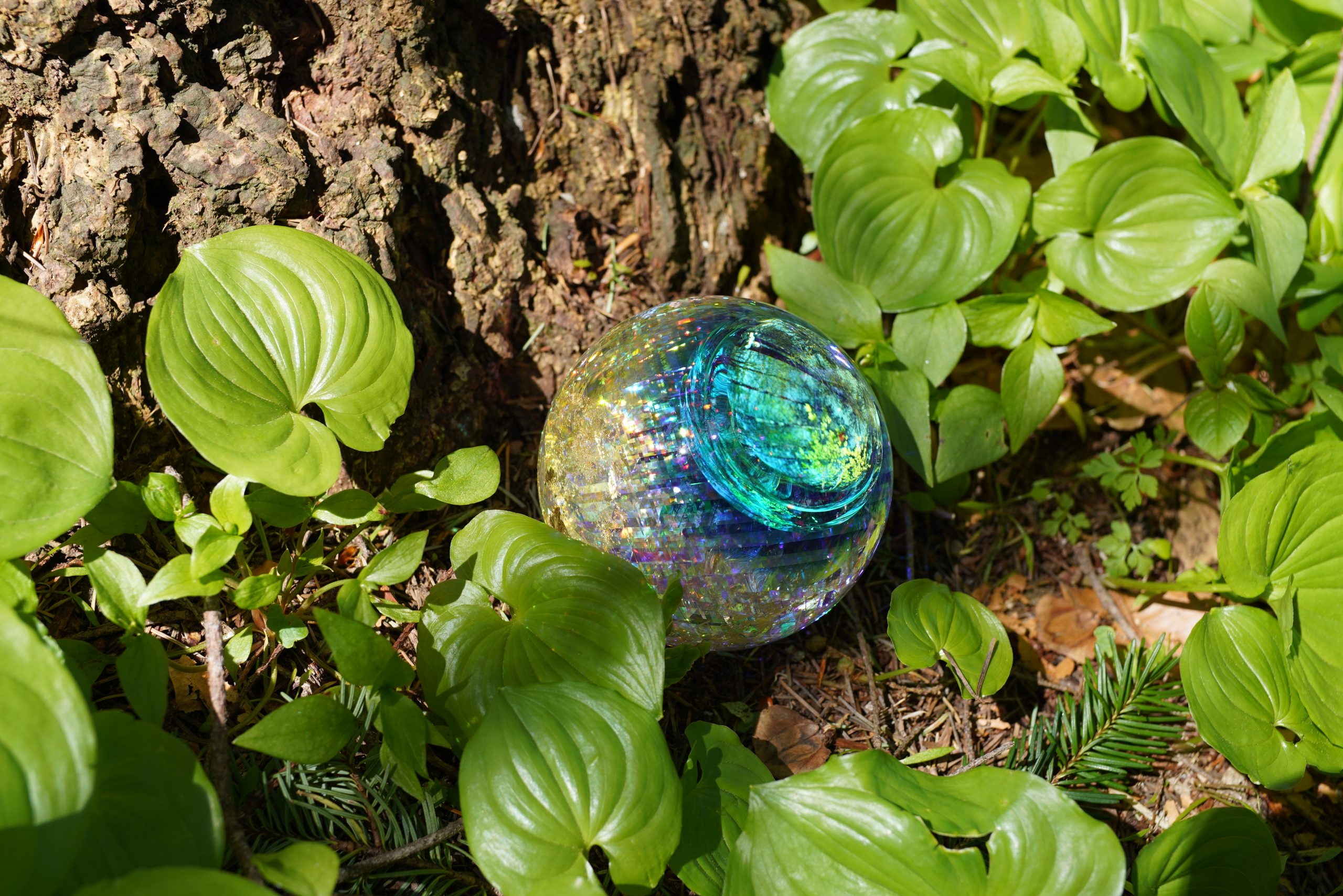 Embedded within are delicate inclusions of gold leaf, radiating warmth and vitality, while a dichroic glass pupil serves as the focal point — shifting in color and light as the viewer moves around it.