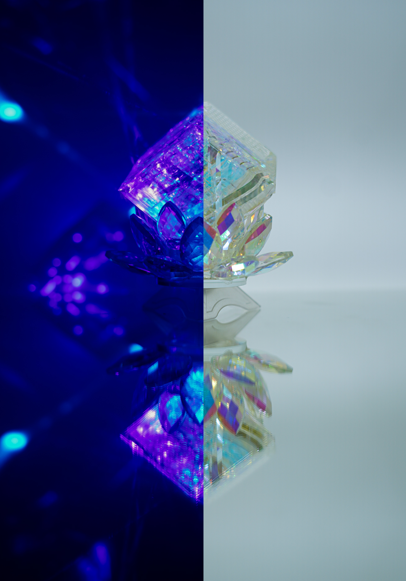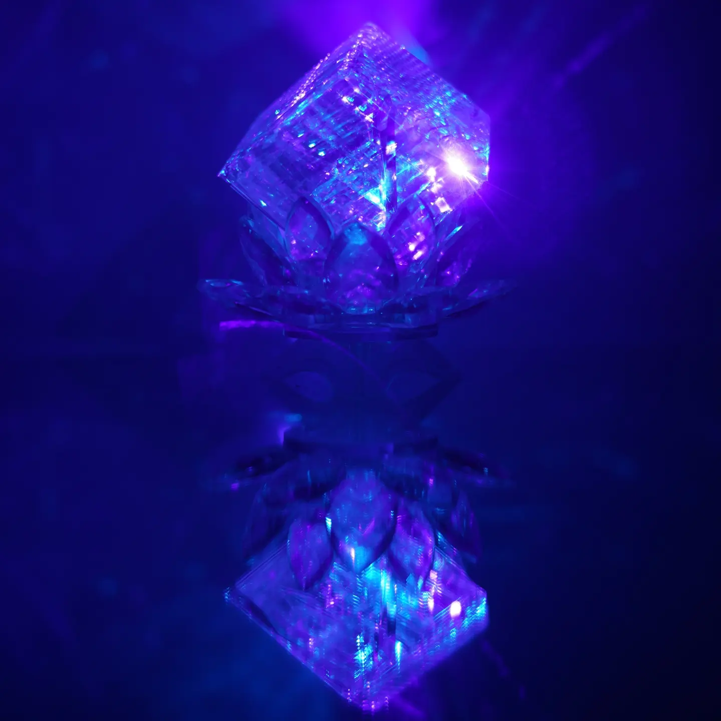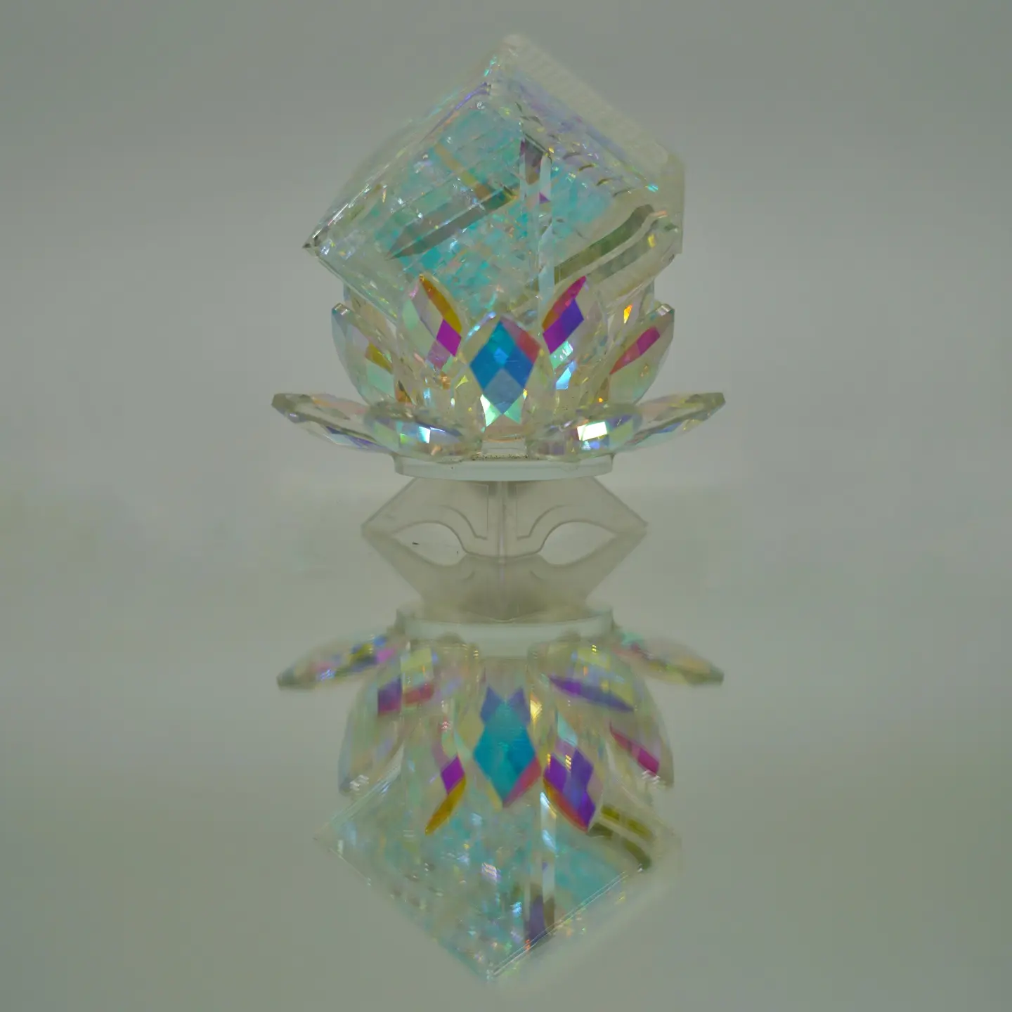 This stone offers magical color-changing displays and features a side with hexagonally textured crystal. When shining light through the textured side in a dark room, a remarkably beautiful and calming pattern effect is revealed. A core containing many layers of dichroic glass is accompanied by matching slabs of Icelandic Spar Crystal and then fully encased in crystal.