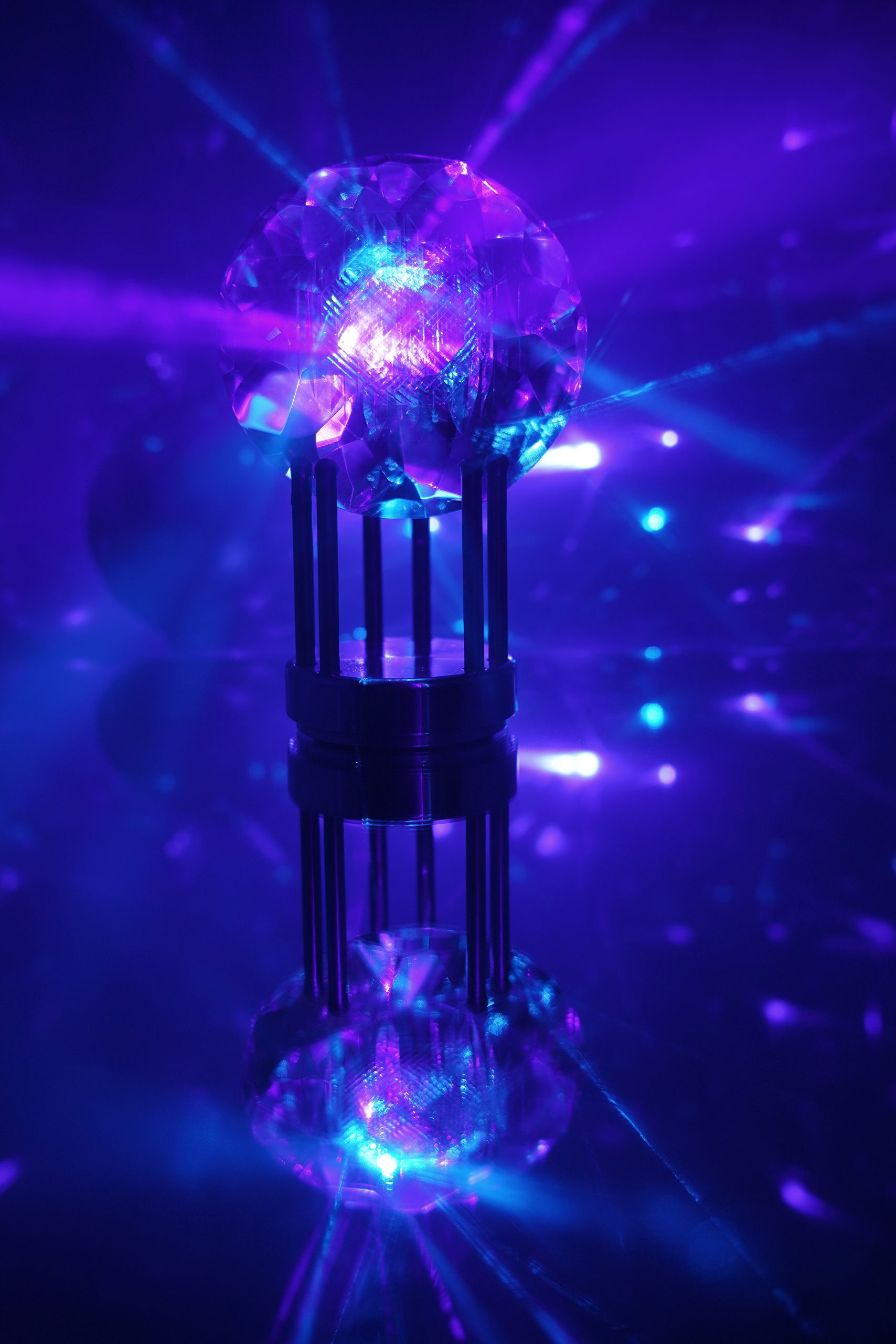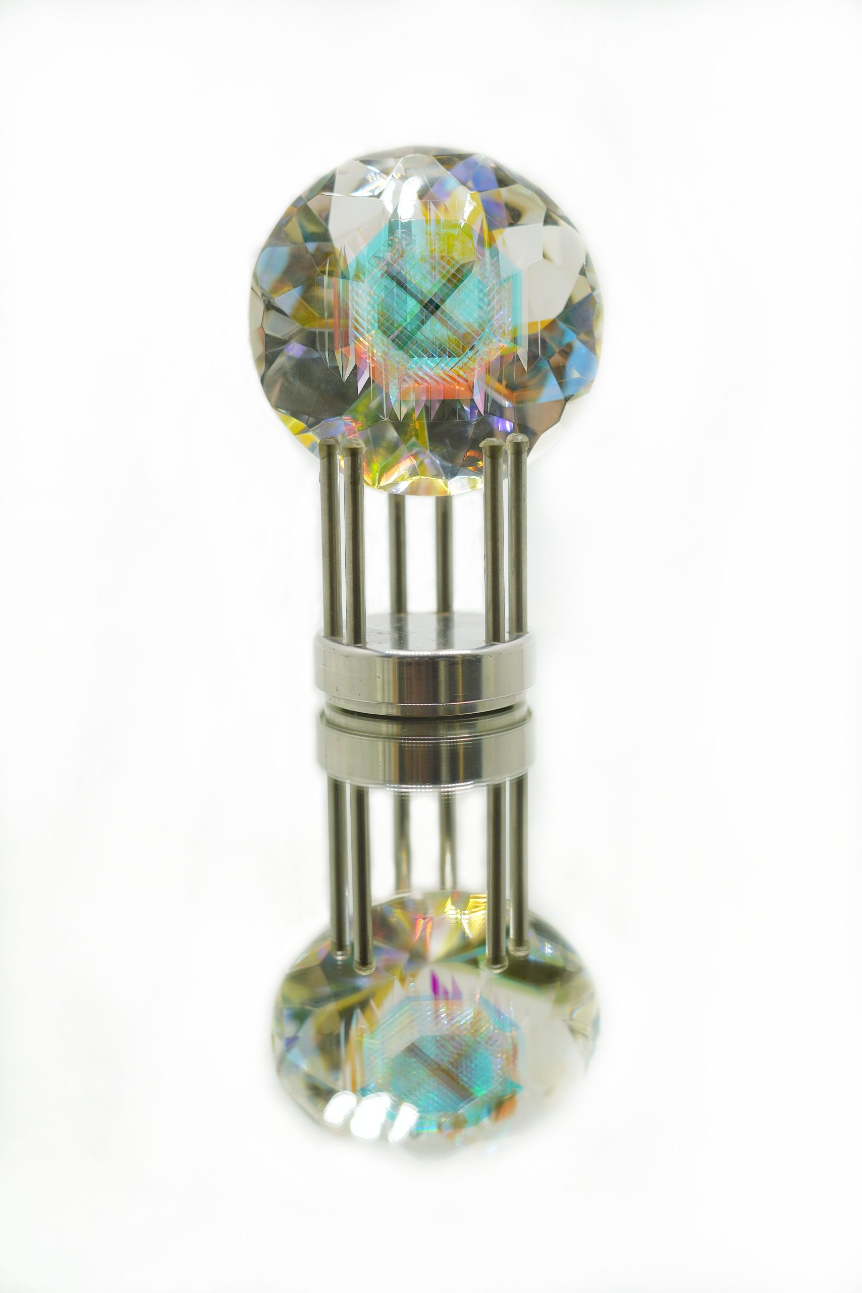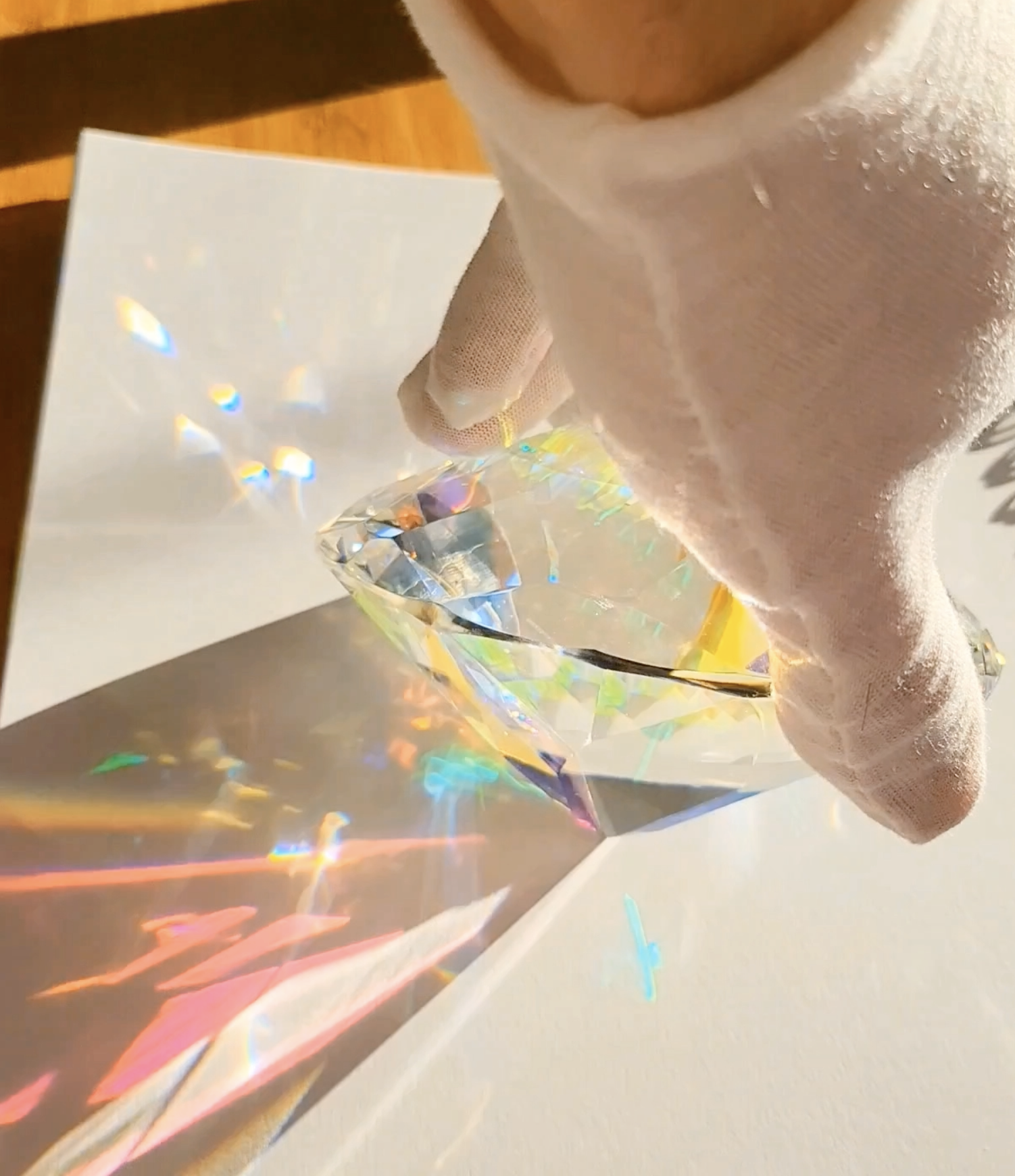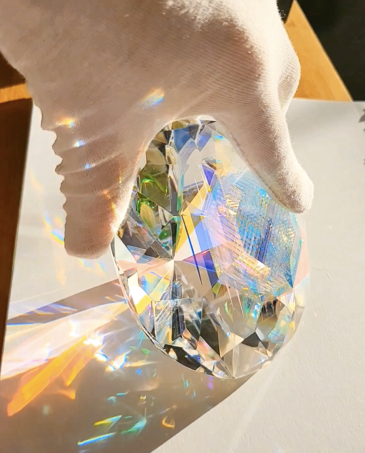 This massive brilliant diamond shaped crystal boasts a dazzling array of colourful reflections. Numerous layers of dichroic glass imbue a playful yet elegant feeling to this royal jewel. This is the very gemstone design the artist presented to his fiancé when he proposed.