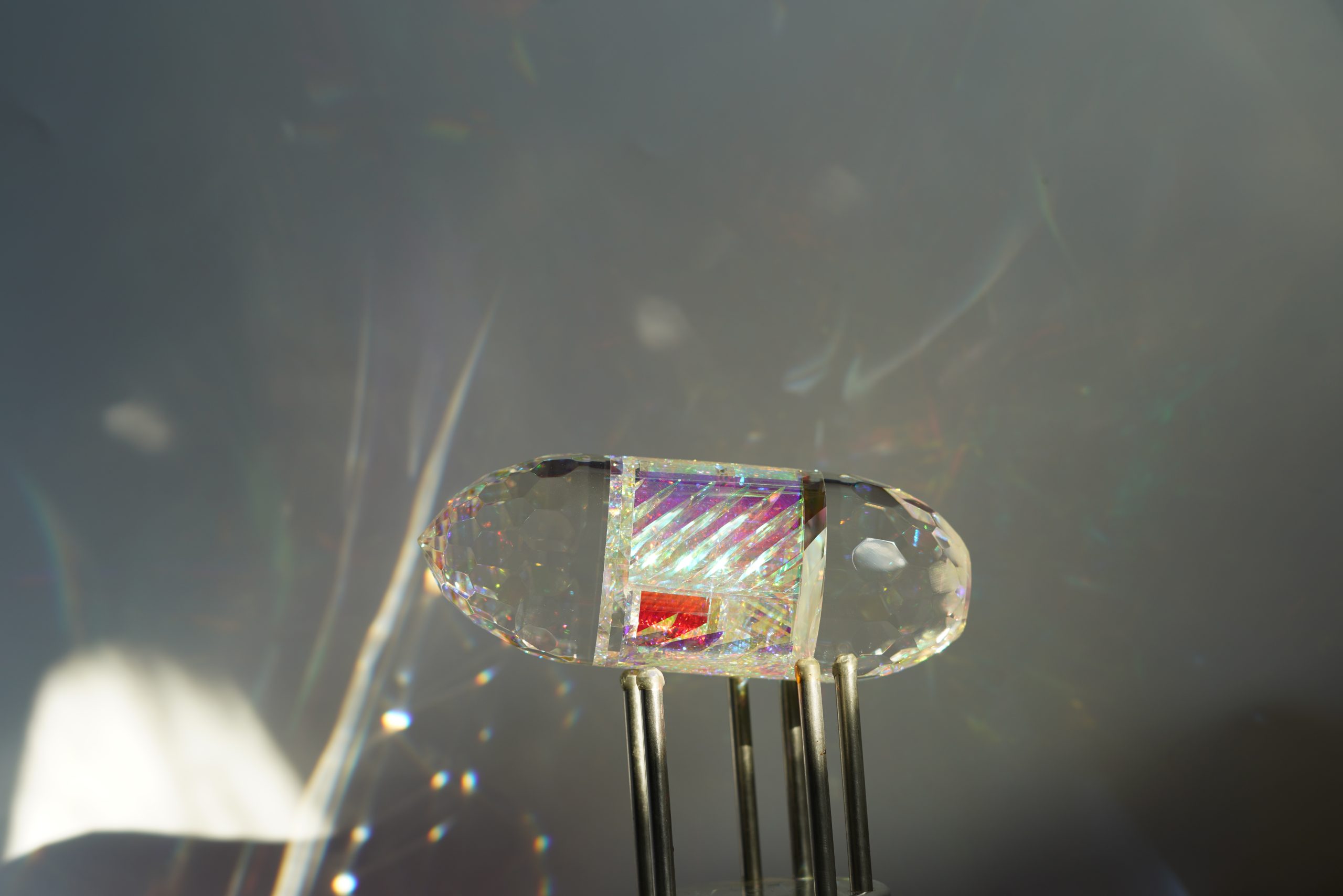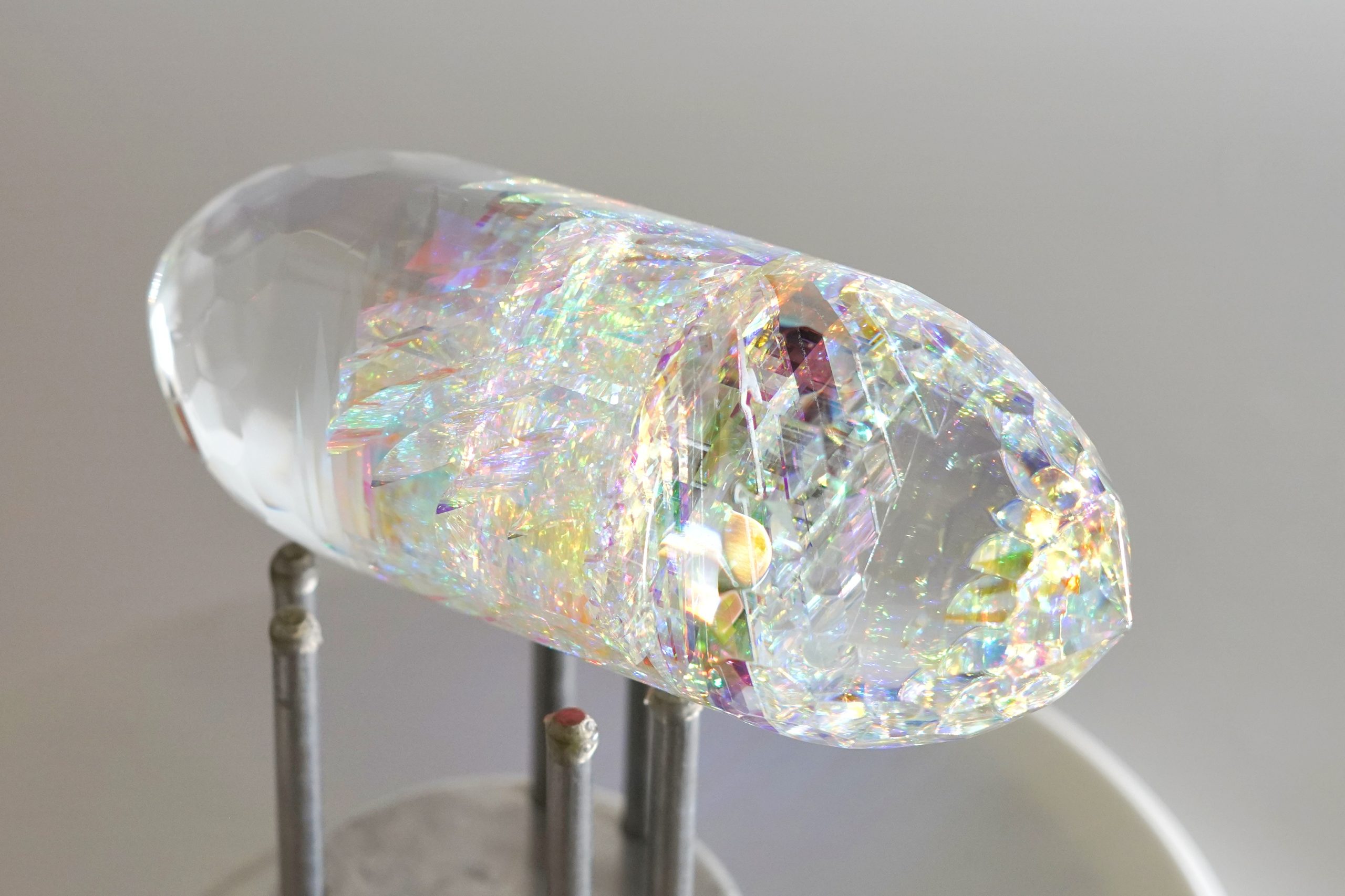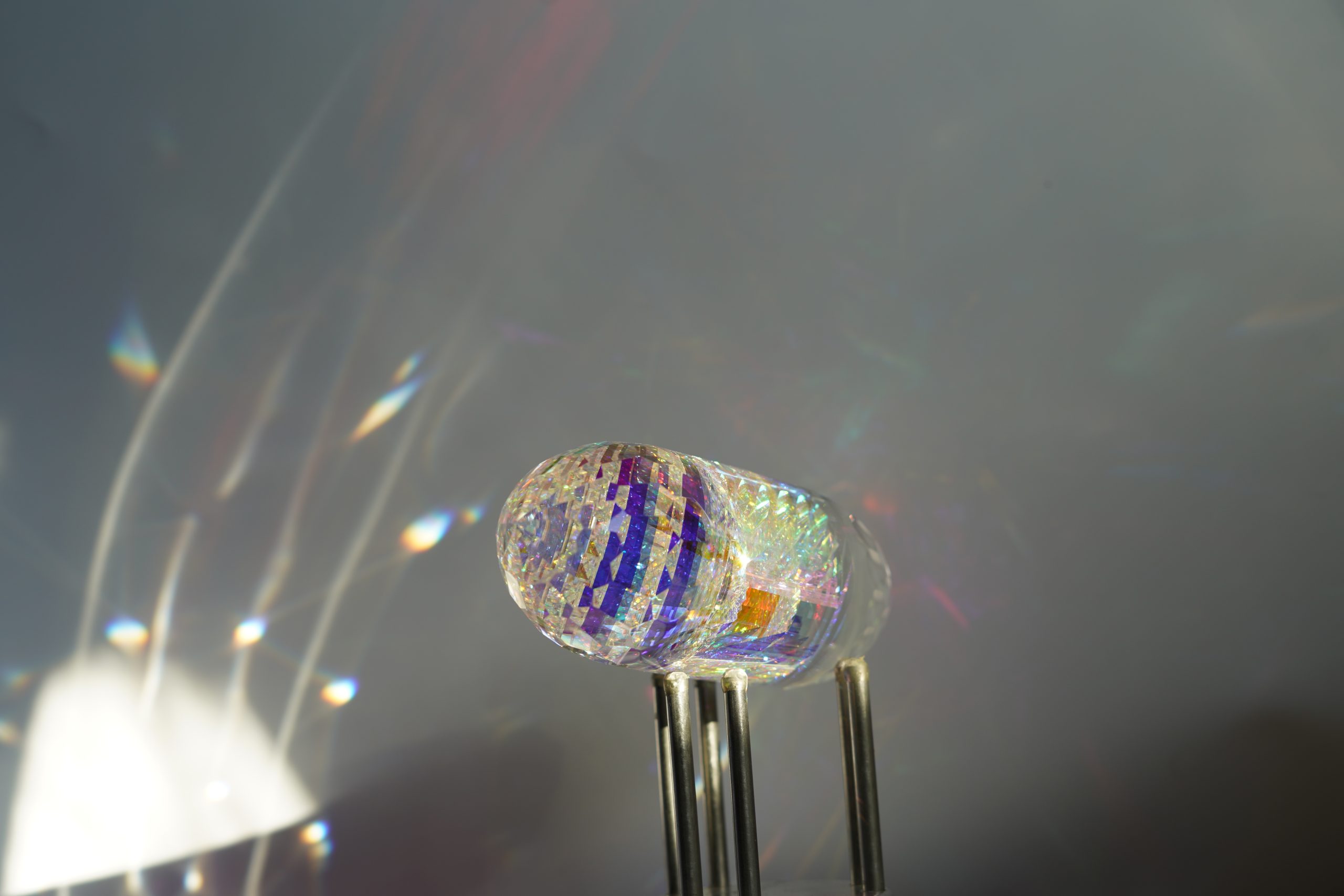 Featuring a smooth cylindrical heart & containing over 50 intentionally layered crystal and dichroic glass components, this (1Kg) gemstone’s 100 facets and countless inner reflection/refraction points synergize for an unforgettably colourful display, especially in sunlight or laser light.