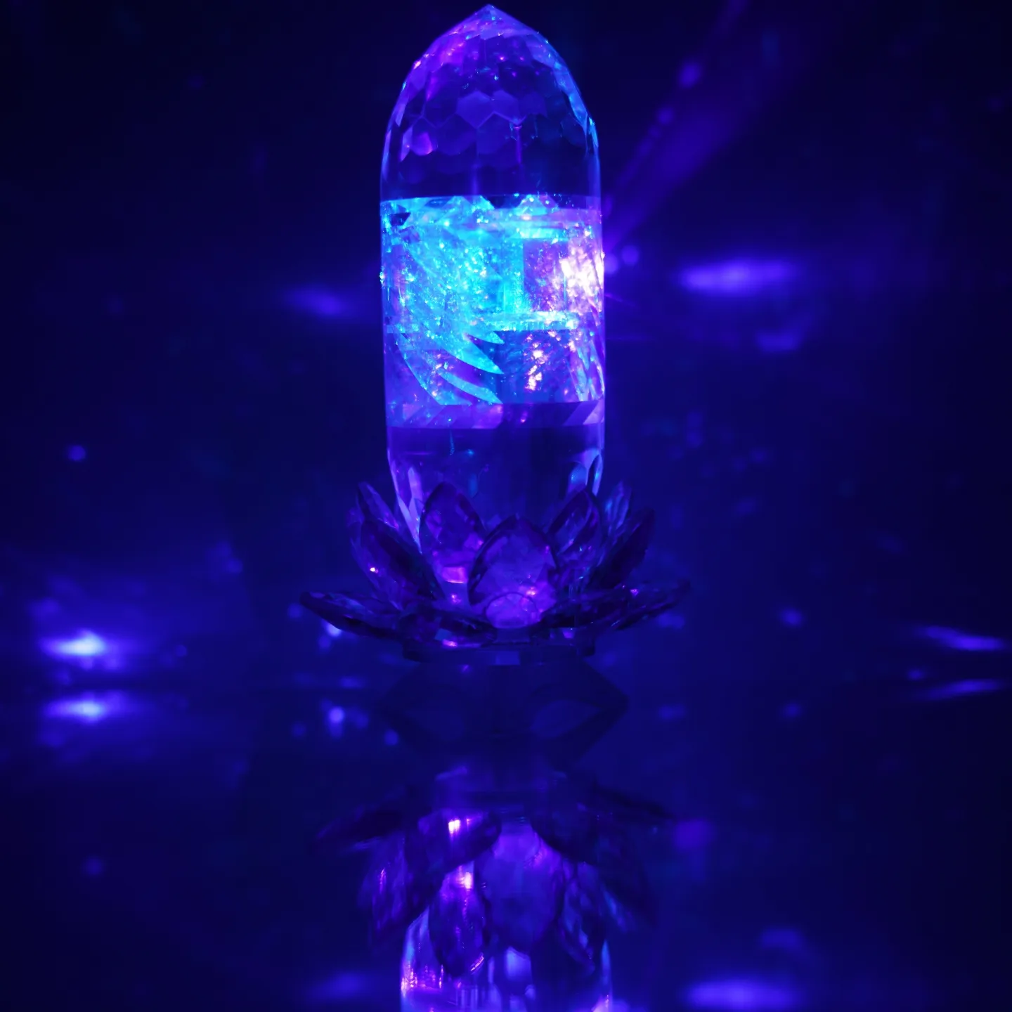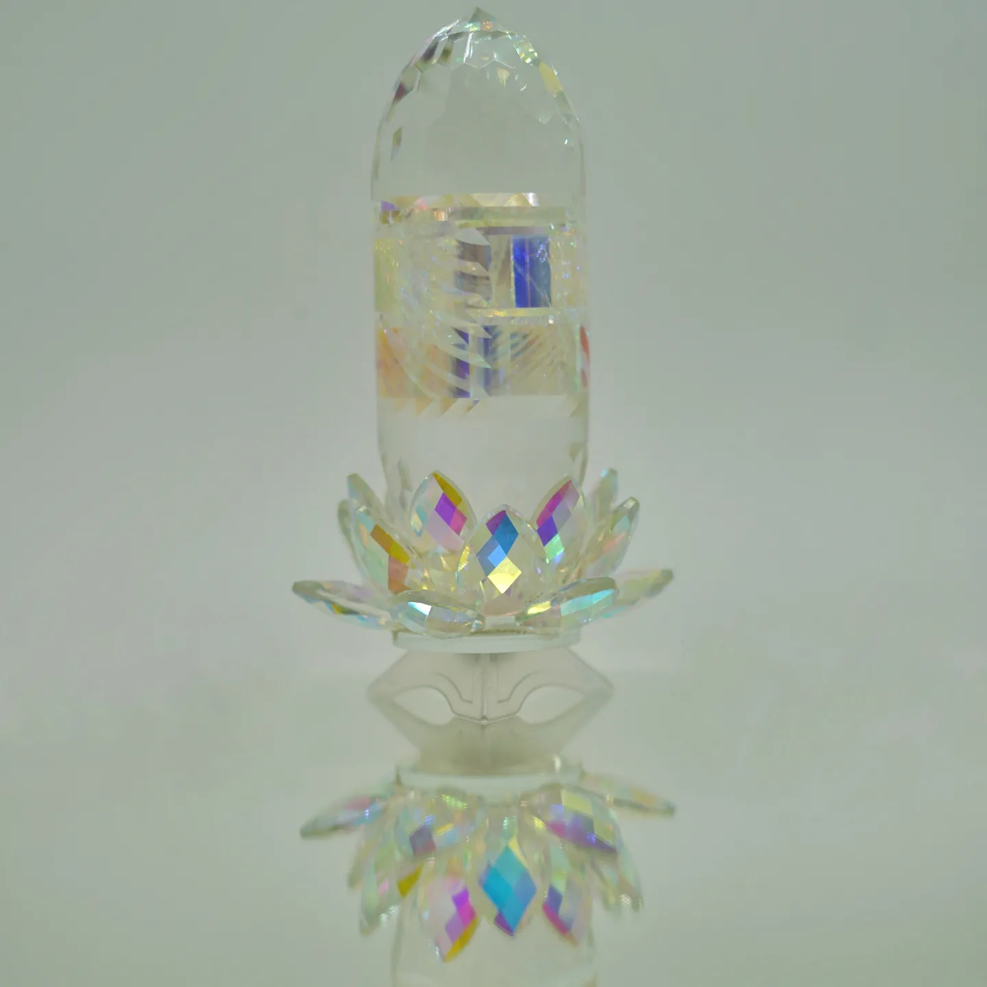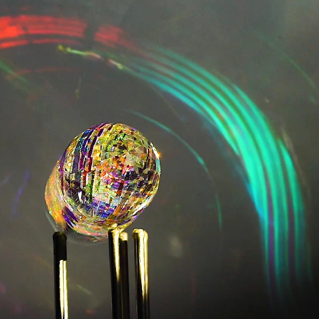 Featuring a smooth cylindrical heart & containing over 50 intentionally layered crystal and dichroic glass components, this (1Kg) gemstone’s 100 facets and countless inner reflection/refraction points synergize for an unforgettably colourful display, especially in sunlight or laser light.
